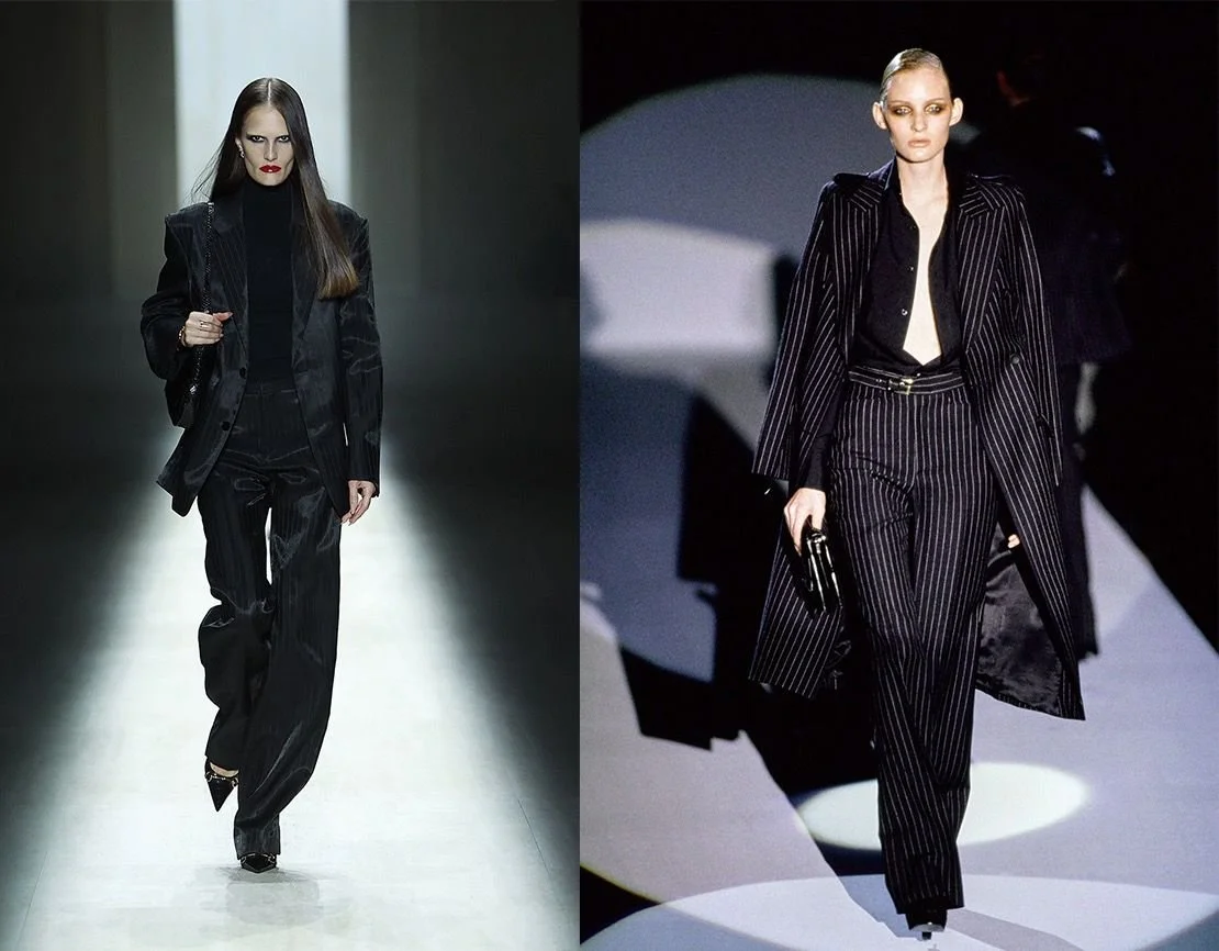 A pinstripe suit worn by Alla Kostromichova that directly called back to Look 48 from the Fall 1996 collection.
