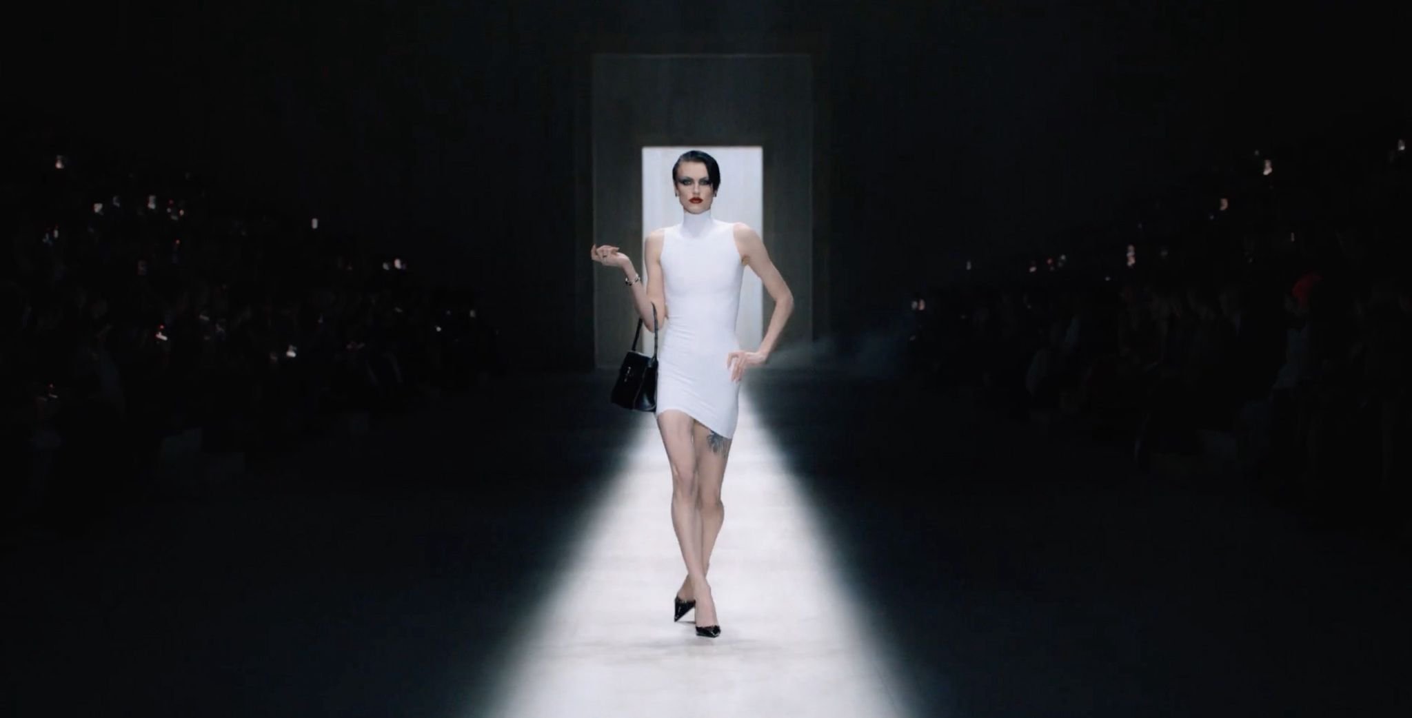 The idea of Gucci as a “house” rather than a “maison” seemed to interest Demna; a place that doesn’t latch onto nostalgic pretensions but instead rewrites itself with the influx of the everyday. This informed the first section of the collection: a cavalcade of sexed-up club queens and juice-heads in leggings and muscle-tees; bedazzled body-con dresses and t-shirts seedily worn as Roman stolas; a shoulder-slung monogram fanny-pack from within which party favours might burst, or the louche irreverence of a mini-dress that perhaps overdid it on its prefix.